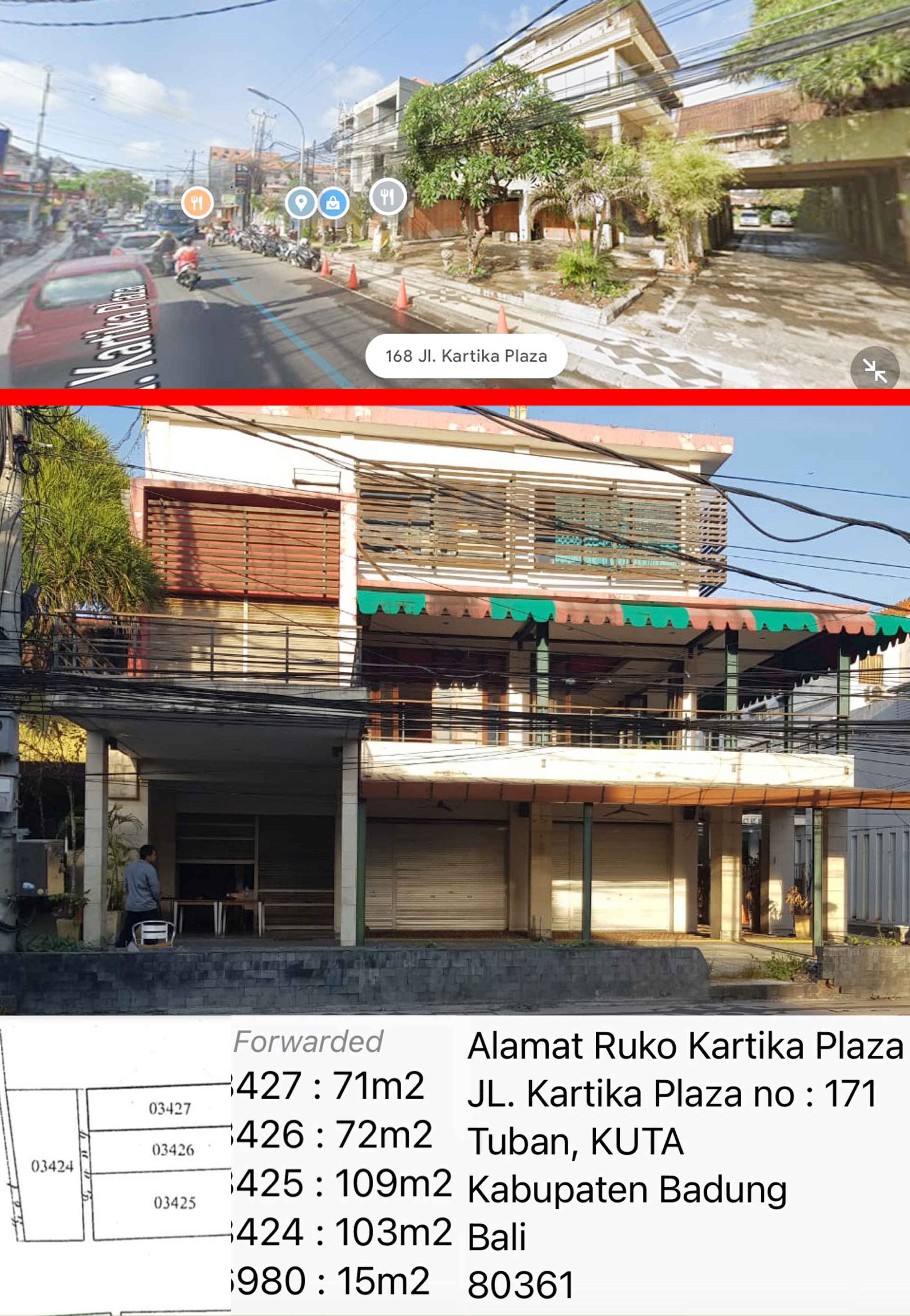 - Lokasi Tanah berada di 0 Jalan Raya Kartika Plaza - seberangnya Hotel Dynasty, sebelumnya Bangunan dioperasionalkan sebagai Restaurant